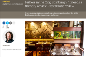 Jay Rayner in The Observer reviewed Fishers in the City, Edinburgh “Fishers in the City could be a truly terrific fish restaurant, if it weren’t for the small things that aren’t terrific. All the essentials are here: there are oysters, left unmolested, or grilled with a bone-marrow crust… soup is a cream-ballasted chowder, made with salmon and smoked […]